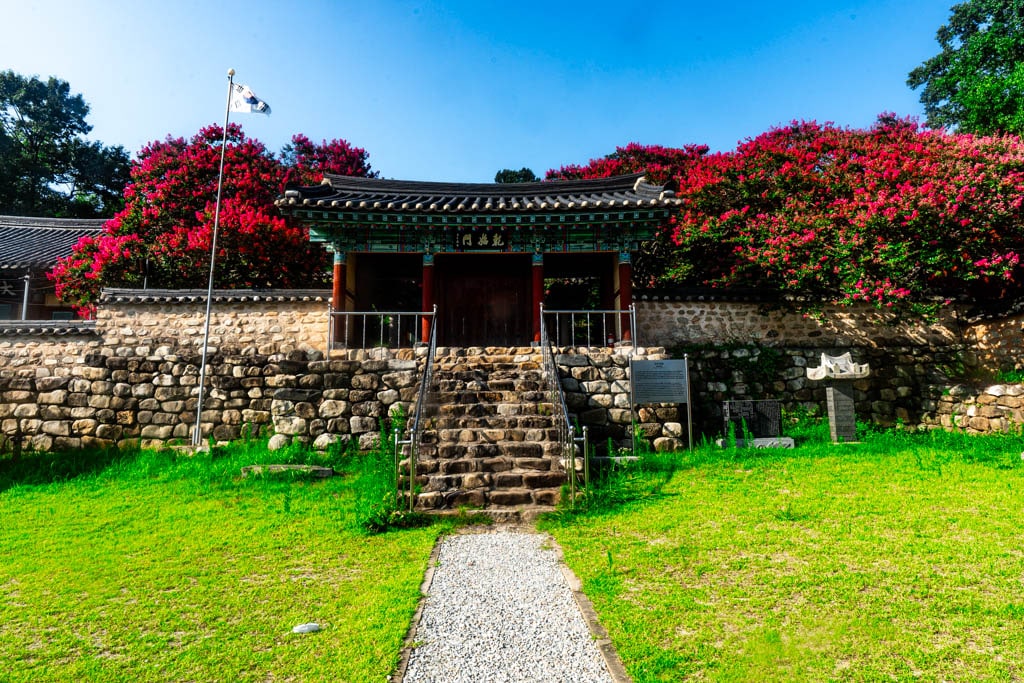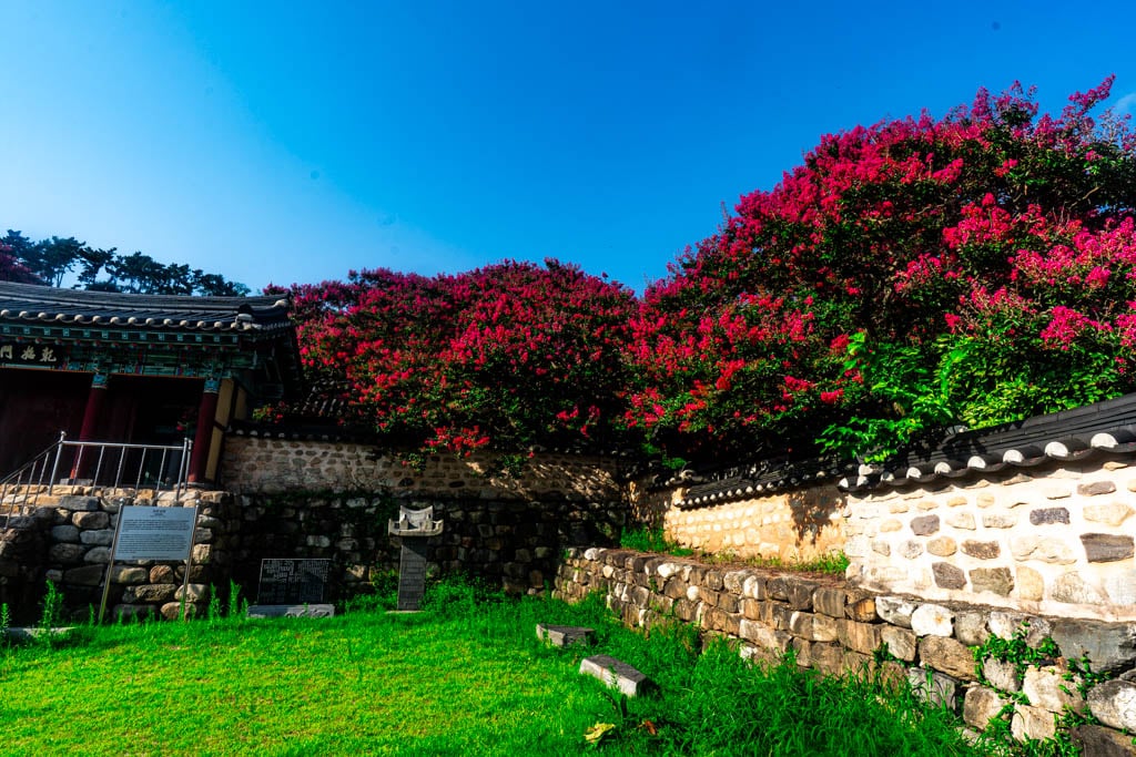 여름이 되면 옥구향교는 화려한 배롱나무꽃(백일홍)으로 더욱 특별한 모습을 드러냅니다. 7월 중순부터 8월 중순까지, 향교의 담장길과 대성전, 명륜당 주변을 따라 붉은빛에서 분홍빛까지 다양한 채도의 배롱나무꽃이 만개해, 마치 한 폭의 수채화 같은 풍경을 연출합니다.