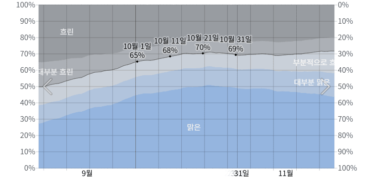 반면 10월달, 제주시 기준 하늘에 구름이 있거나 대부분 구름이 있는 흐린 날씨는 35%에서 31%로 감소한다