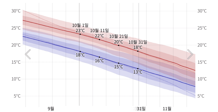 - 10월 1일 18도, 11일 16도 등으로 조금씩 낮아진다.
