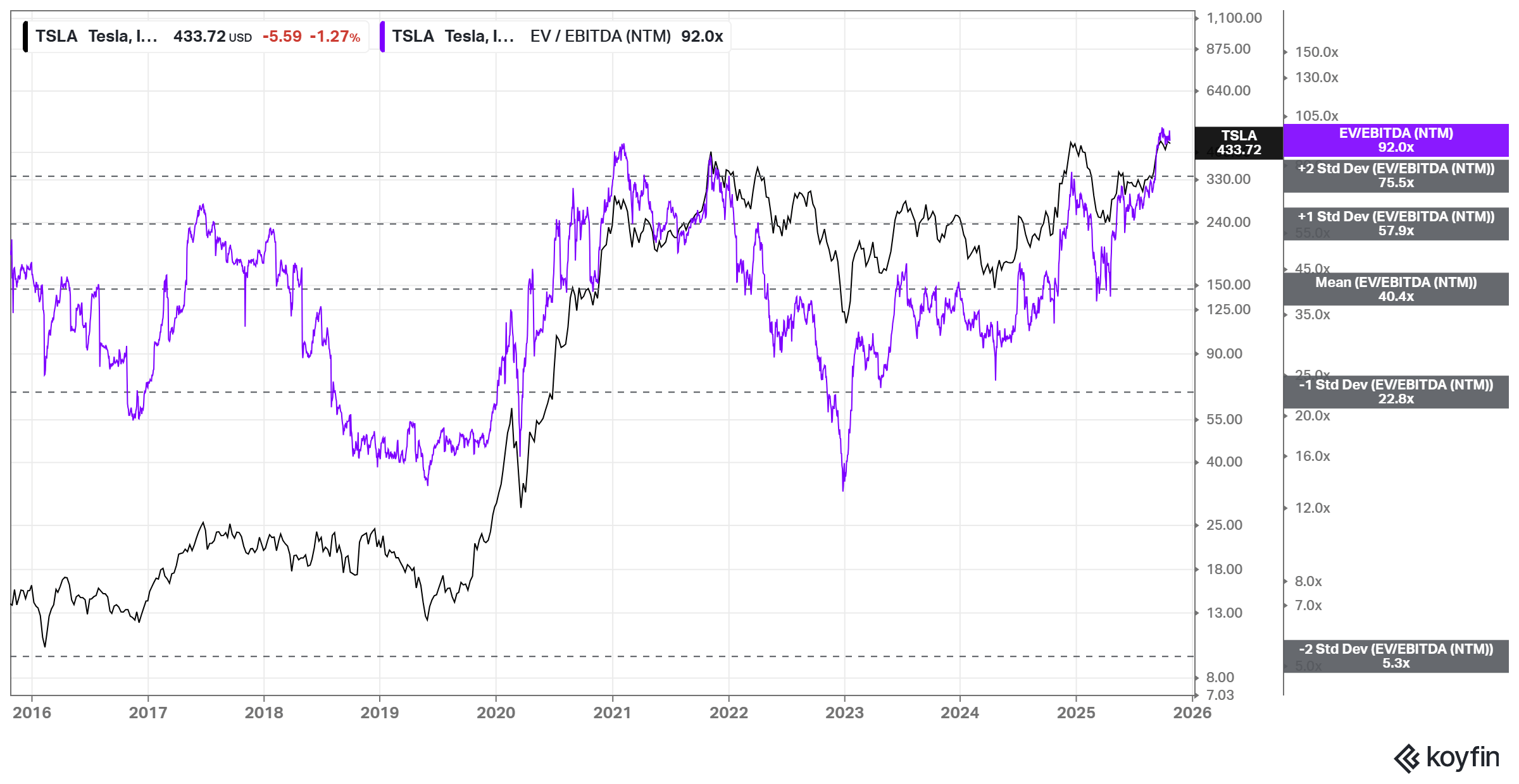 강세론자든 약세론자든, 항상 시야를 넓게 가져야 한다. 명확한 사실 한 가지는 TSLA의 선행 EBITDA 배수가 90배를 상회하며, 최근 10년간 최고 수준에 근접했다는 점이다. 과거 사례를 봐도, 이 구간에서 모멘텀이 강세론자에서 약세론자로 전환될 경우 지금 수준에서 포지션을 쌓는 것은 지속 가능하지 않을 수 있다.