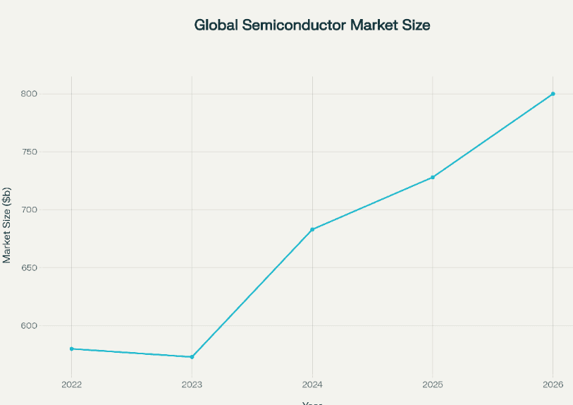 연도별 글로벌 반도체 시장 규모(단위: USD 억 달러)는 아래 그래프와 같이 2024~2026년에 급격한 성장세를 이어갈 것으로 예상됩니다.