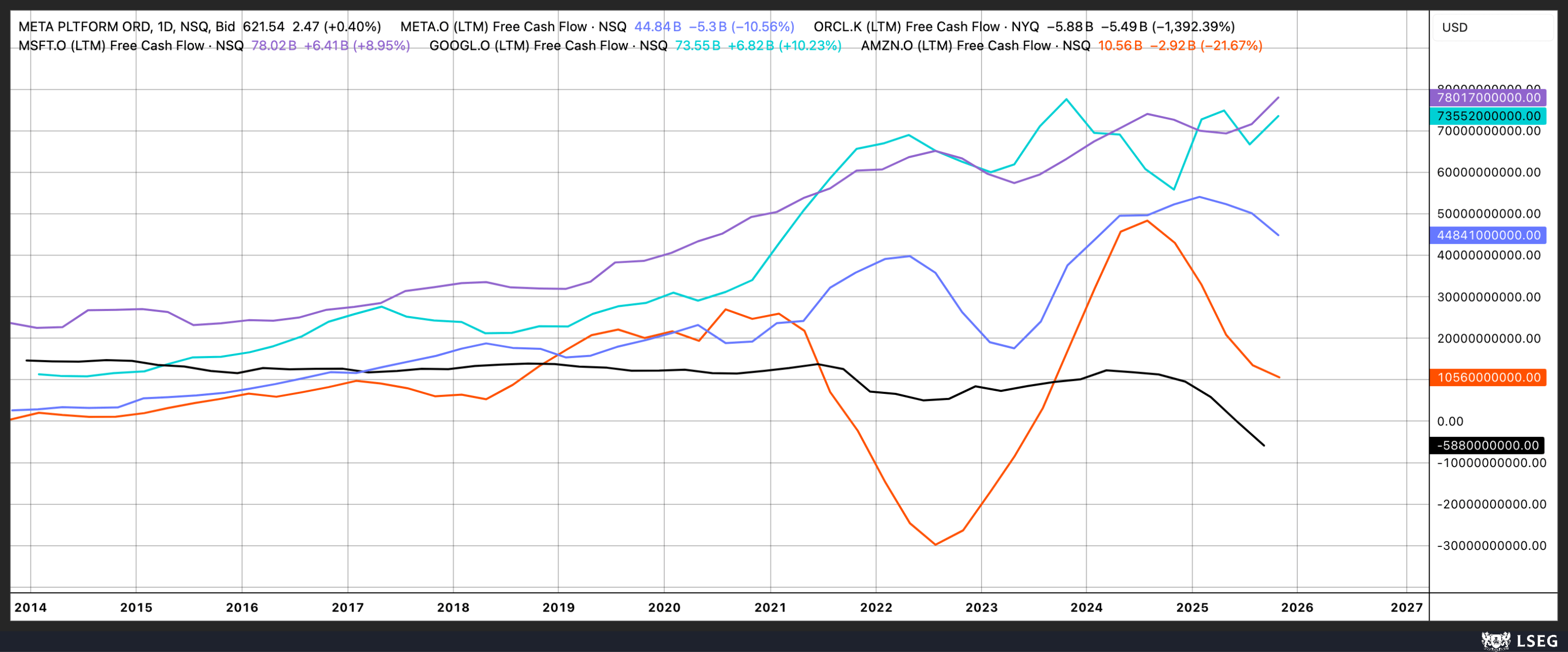 잉여현금흐름 감소는 Oracle만의 문제가 아니다. Meta(META)와 Amazon(AMZN)에도 동일하게 적용되는 문제다. 최근 12개월 동안 이 세 기업 모두 잉여현금흐름이 감소했다. 한편 Alphabet(GOOG)(GOOGL)과 Microsoft(MSFT)는 아직까지 잉여현금흐름이 증가하고 있지만, 이는 당분간일 뿐이다.
