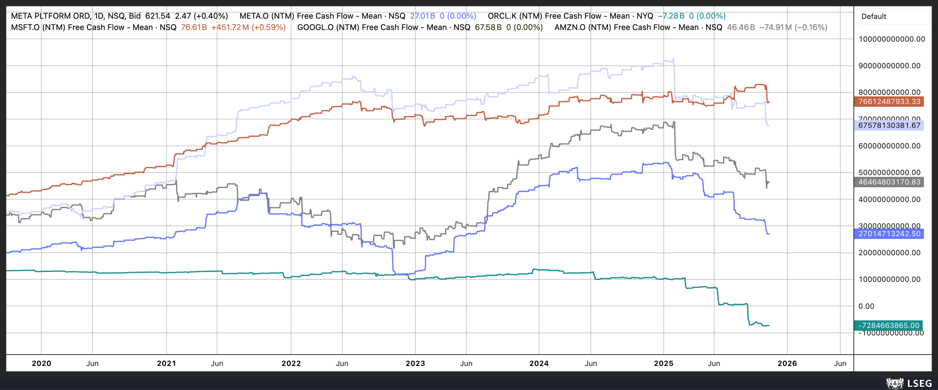 Microsoft와 Alphabet의 경우, 앞으로 12개월 동안 모든 하이퍼스케일러의 잉여현금흐름이 감소할 것으로 애널리스트들은 예측한다. Oracle과 Meta가 하락세를 주도하고 있다. 이러한 전망 변화로 인해 이들 종목의 주가가 최근 몇 주간 하락세를 보였다.
