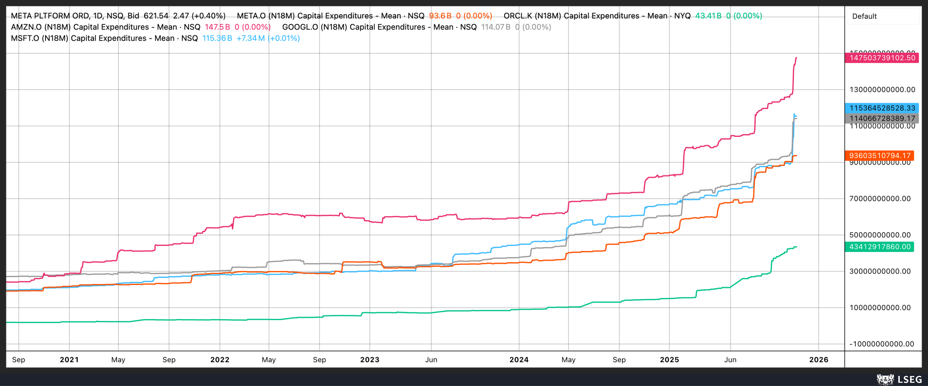 자본적지출이 잉여현금흐름 감소의 가장 큰 요인이며, CapEx는 앞으로 18개월 동안 더욱 급격히 증가할 전망이다. Amazon, Alphabet, Microsoft가 가장 많은 투자를 하고 있으며, 그 뒤를 Meta와 Oracle이 잇고 있다.