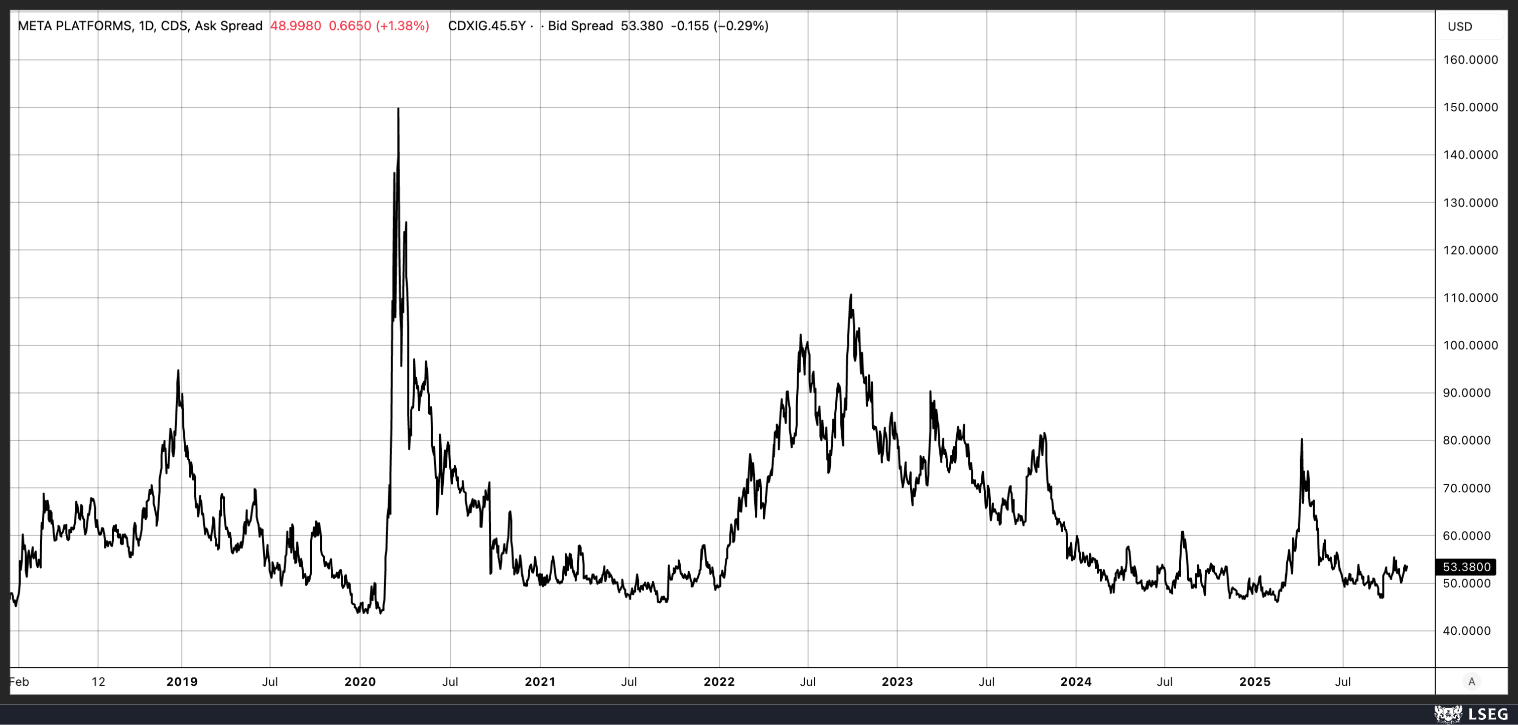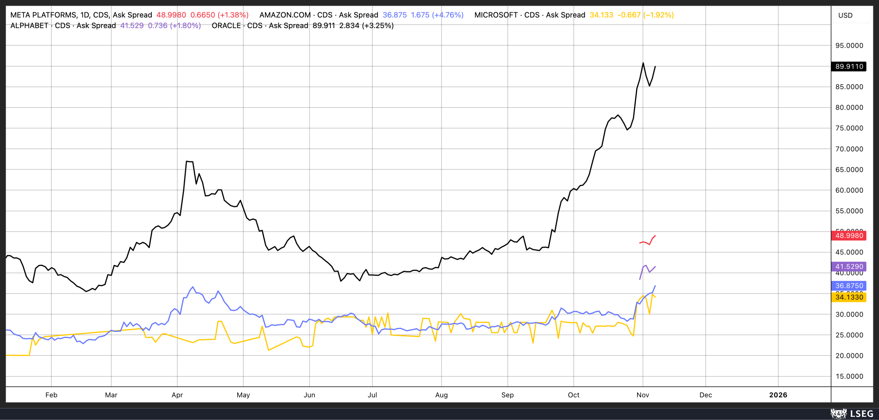 - 신용시장은 위험을 재배분하고 있으며, 실제로 ORCL(Oracle), MSFT(Microsoft), AMZN(Amazon)의 CDS 스프레드가 상승했고, GOOGL(Alphabet)과 META(Meta)의 CDS도 신규 상장 이후 상승세를 보이고 있다.