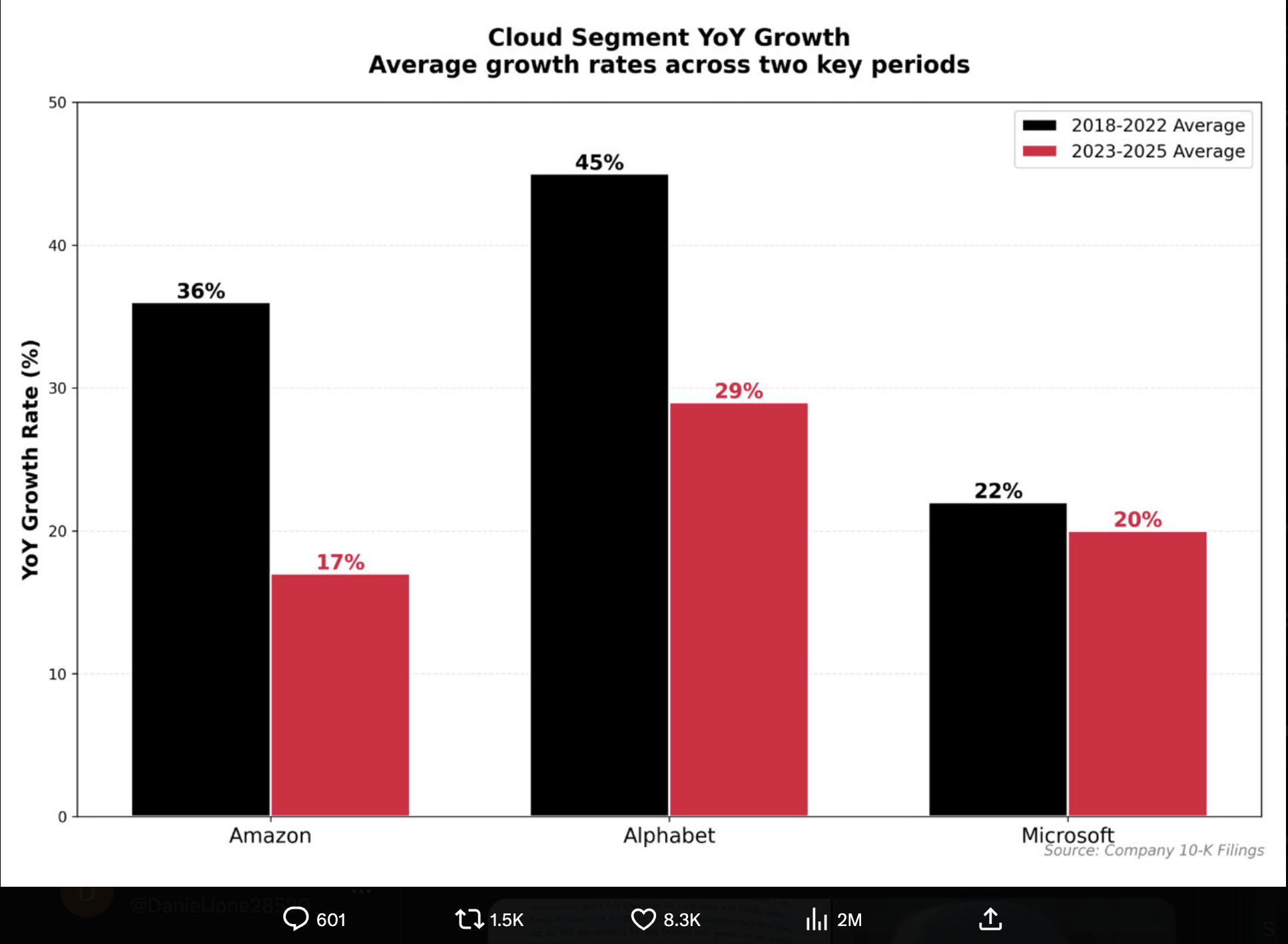 물론 팔란티어 테크놀로지스는 통신 기업이 아니다. 버리는 당시 주요 통신사들이 실제 가동 용량은 매우 제한적임에도 높은 밸류에이션을 받았다는 점을 지적한 것이다. 즉, 수요 급증을 기대해 과도하게 설비투자가 집행된 구조다. 그는 이 주장을 뒷받침하기 위해 위와 같은 차트를 제시했다. 이 차트는 3대 클라우드 컴퓨팅 기업들의 클라우드 사업 연평균 성장률이 2018~2022년 대비 2023~2025년에는 둔화되고 있음을 보여준다.