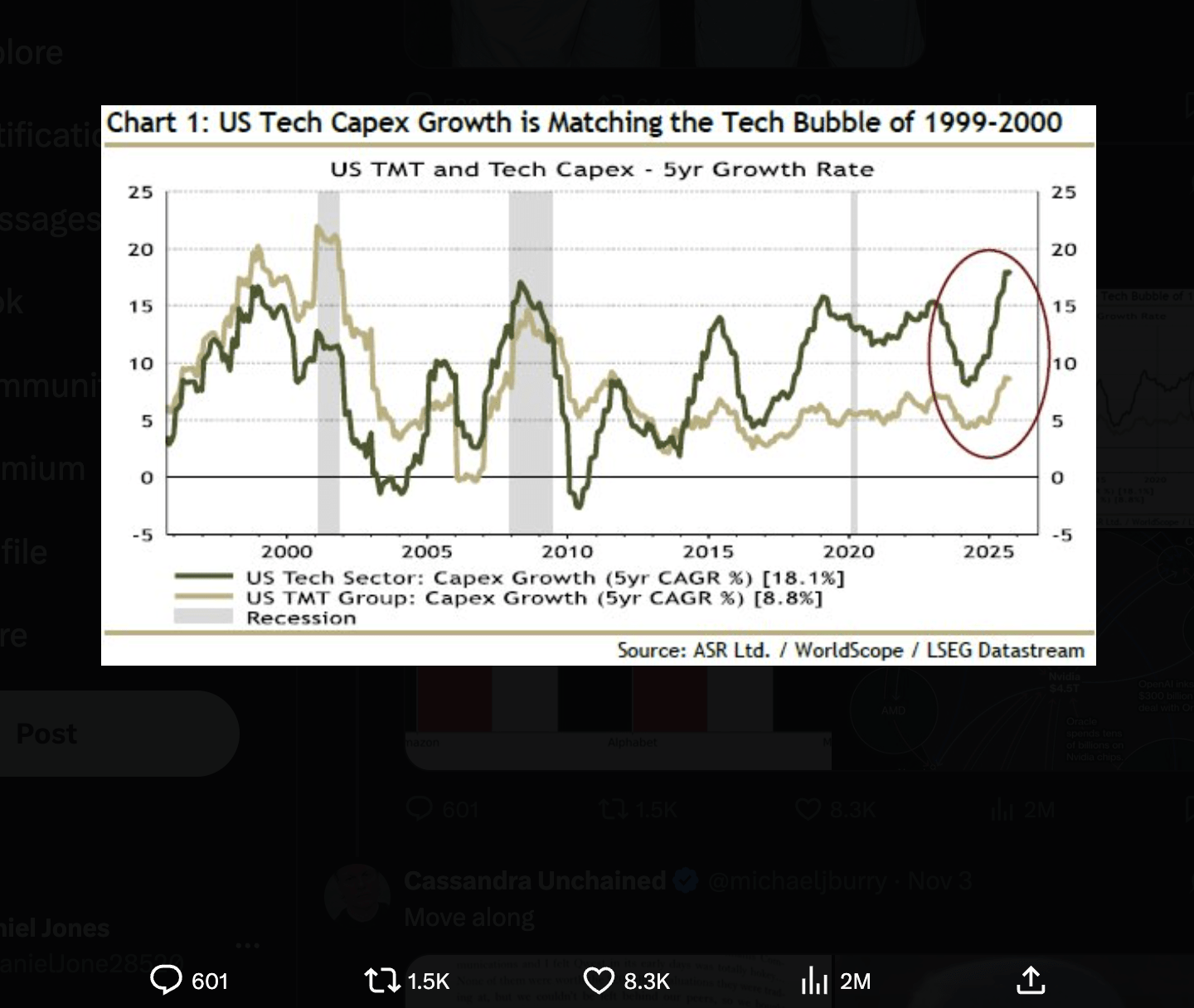 이와 함께, 그는 소셜 미디어를 통해 자신의 투자 논리를 보여주는 여러 게시물을 올렸다. 여기에는 그가 다음과 같은 메시지에 밑줄을 그은 책의 한 페이지가 포함되어 있었다. ‘2002년 당시 미국 통신용량의 사용률이 5% 미만이라는 보도가 흔했다’, ‘2001~2002년 도매 통신요금은 연간 70% 이상 하락했다’, ‘불과 얼마 전까지만 해도 투자 자본 대비 대규모 프리미엄을 받던 기업들이 채권자 보호를 찾았다’는 구절 등이다.