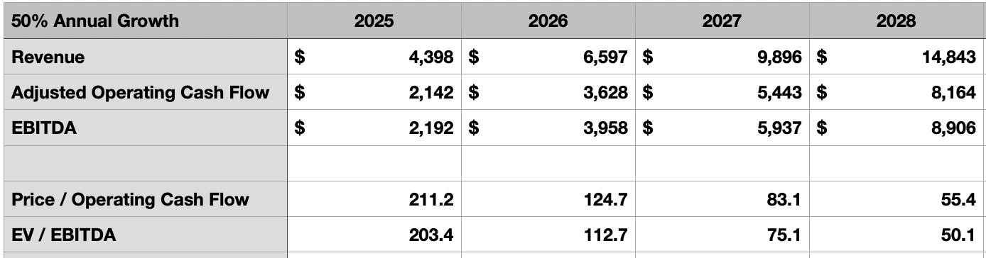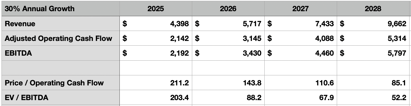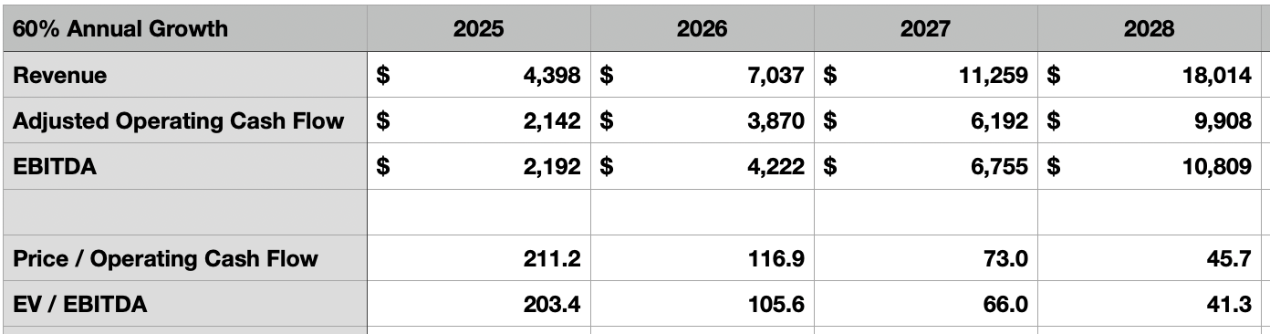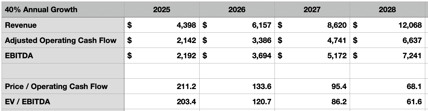 위 두 표와 아래 두 표는 향후 수년간의 다양한 성장 시나리오(연매출 성장률 30~60%)를 보여준다. 마진 확장도 고려했다. 현금흐름 대비 주가 비율은 앞으로 55%로, EBITDA 마진은 60%를 가정했다. 올해 가이던스 중간값을 적용하면 각각 48.7%, 49.8% 수준이다. 심지어 상단 시나리오가 실현된다 해도, 2028년 기준으로 현금흐름 기준 주가배수는 45.7배, EV/EBITDA는 41.3배에 달한다. 이런 밸류에이션이 지금보다 합리적으로 보일 수도 있지만, 이렇게 먼 미래까지를 미리 반영하는 것은 납득하기 어렵다.
