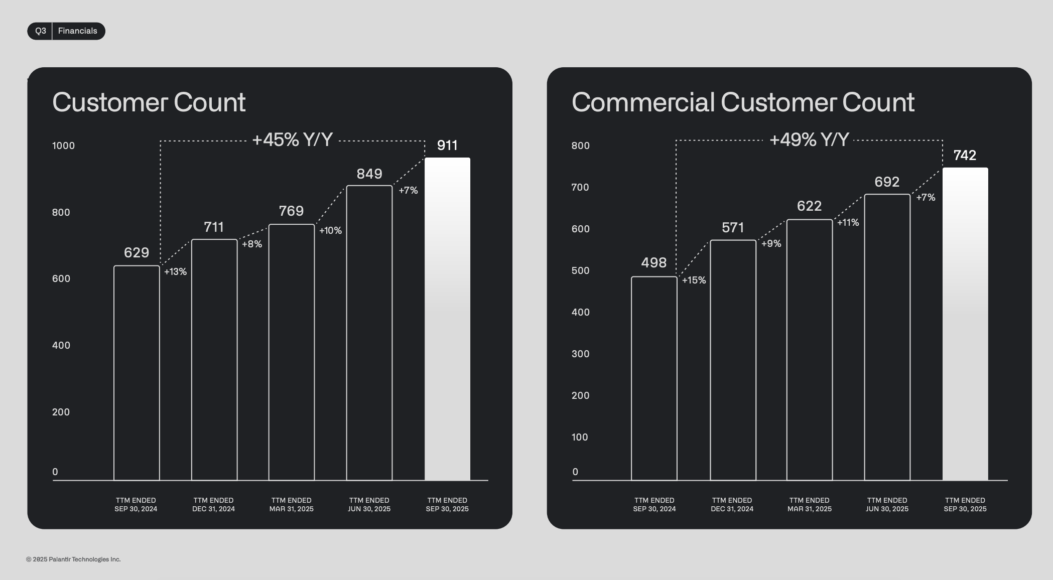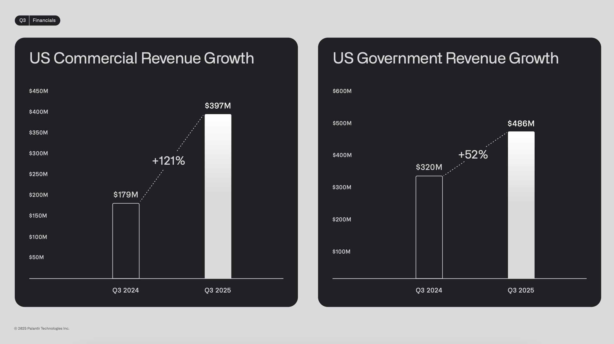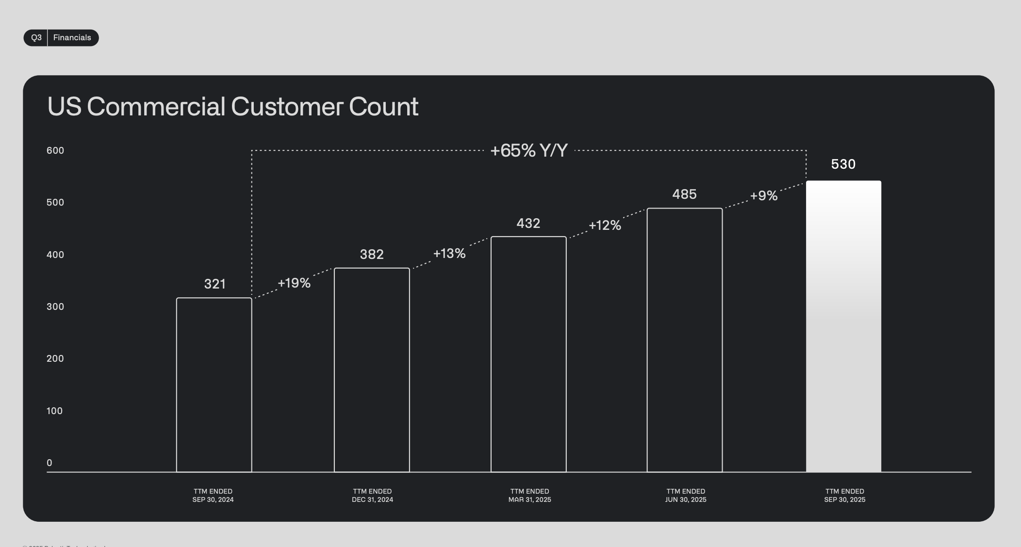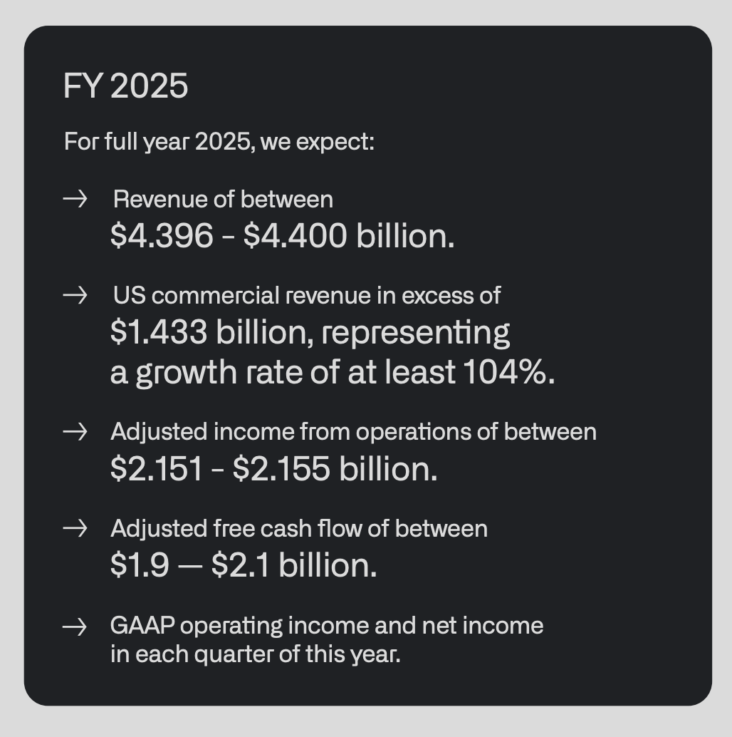 이러한 성장에는 여러 가지 요인이 있다. 특히 상업 부문의 매출이 폭발적으로 성장했다. 미국 상업 부문 매출은 전년 대비 121% 급증해 1억7900만 달러에서 3억9700만 달러로 늘었다. 전체 상업 부문 매출 성장률은 73%에 달하며, 전체 매출도 3억1700만 달러에서 5억4800만 달러로 뛰었다. 같은 기간 상업 고객 수는 498명에서 742명으로, 미국 지역만 따져도 321명에서 530명으로 급증했다. 경영진은 본래 정부 부문을 기반으로 설립된 회사임에도, 상업 부문에 더 큰 성장 기회가 있다고 판단해 상업 부문 확장을 목표로 삼았다. 지금까지 이러한 전략은 성공적이었다.