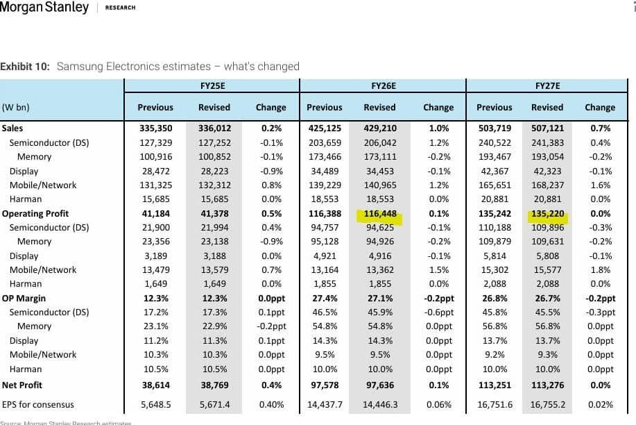 모건스탠리의 최신 보고서는 2026년 삼성전자 영업이익을 약 116조원(25년 41조원, 27년 135조원)으로 매우 공격적으로 전망합니다.