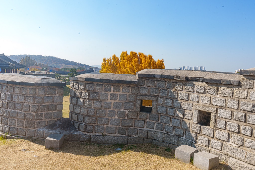 염무대 위쪽으로 가니 성곽 너머 은행나무를 볼 수 있다.