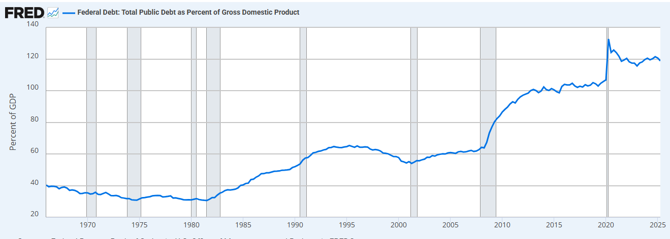 미국 연방 부채는 최근 38조 달러를 돌파했다. 미국의 부채 대비 GDP 비율은 약 120% 수준에 머물러 있다. 이 막대한 부채를 차환해야 하는 상황이, 장기 국채 수익률을 기준으로 산정되는 평균 모기지 금리가 2024년 여름(연준이 현재까지 총 125bp 금리를 인하하기 전 시점)과 비슷한 수준에 머무는 주된 이유다.