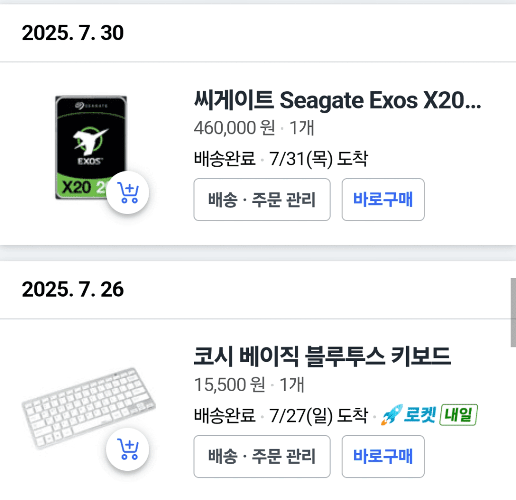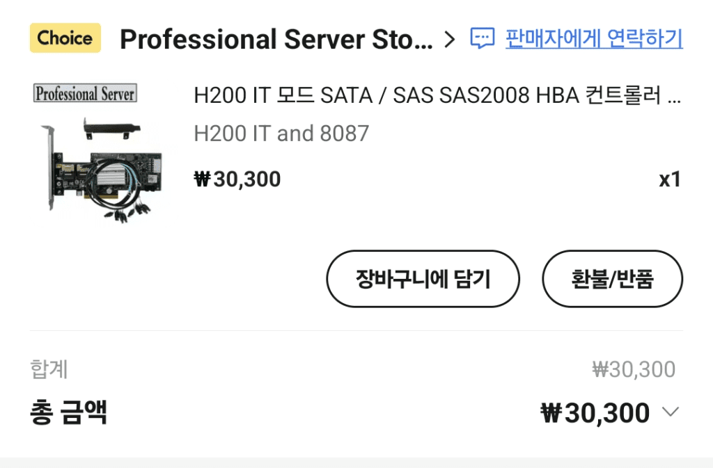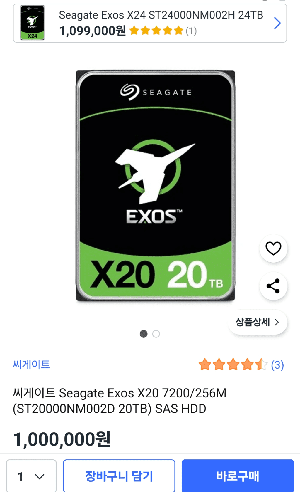 시기는 7월, 시게이트 Exos 20TB 정발이 46만원에 쿠팡에 나온 것이다. 보통 가격은 100~120만원 선 지금 검색하닌 100만원이 나온다. 46만원이 적은 금액도 아니지만 20TB대용량 하드디스크라는 점에서 구매 버튼을 눌렀다. 구매 당시 SAS 하드디스크라는 내용이 잇었지만 어찌되겠지라는 생각에 유의치 않았다.